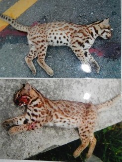 案例:2014年4月 一隻母石虎跨越西濱快速道路後龍路段時被撞死,遭棄置路旁草叢。
